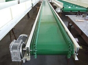 此類裙邊輸送機的結構,是在平形橡膠運輸帶兩側粘上,可自由伸縮的橡膠波形立式“裙邊”,在裙邊之間,又粘有強度和彈性的橫隔板組成匣形斗,使物料在斗中進行連續(xù)輸送。非常的適用粉狀、粒狀及小塊狀物料。